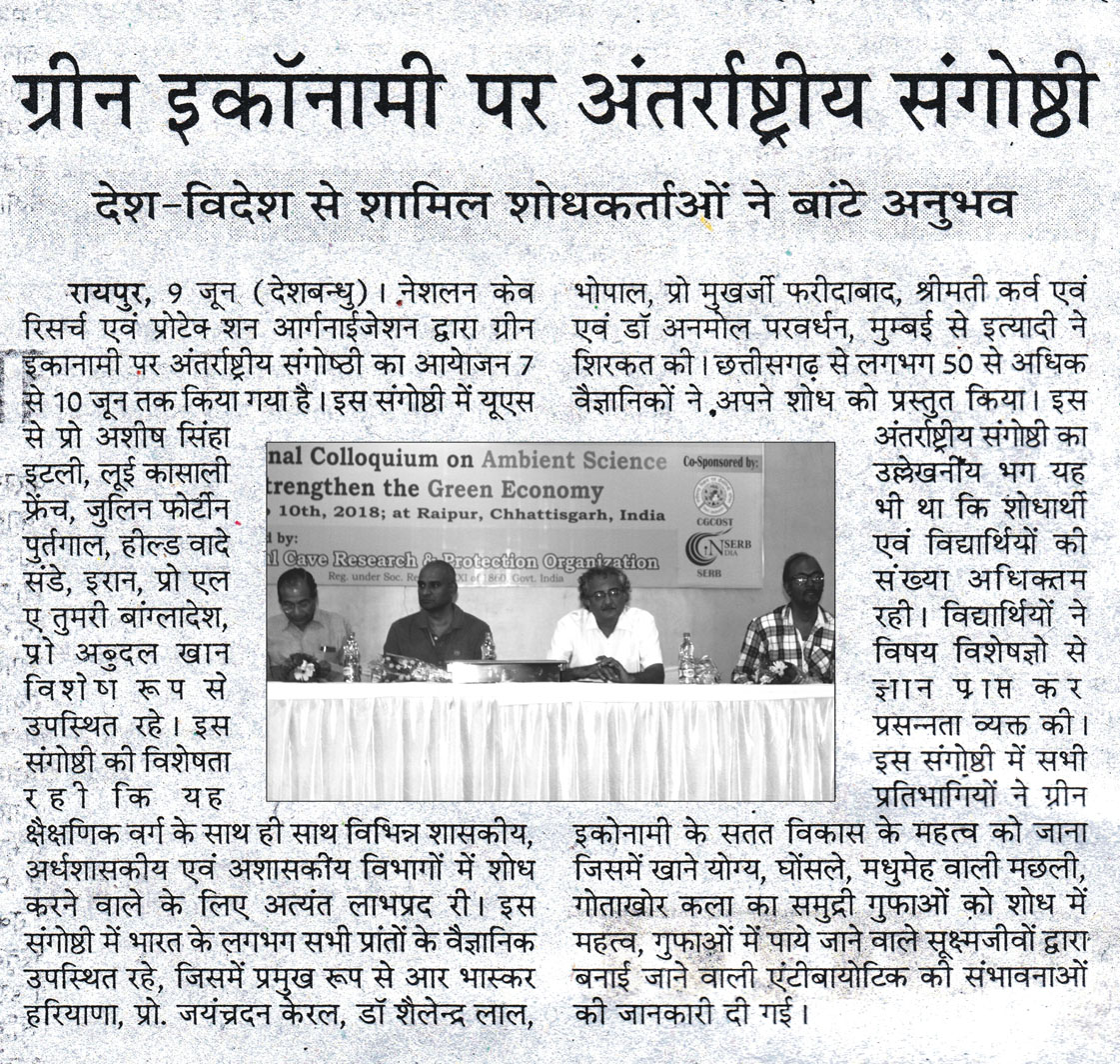 National Cave Research and Protection Organization, India organized an International Conference which was very beneficial to educationists and researchers from the agricultural and environmental sectors too. Eminent scientists, Prof. R.N. Baskar (Haryana), Prof. Jayachandran (Kerala), Prof. Poonam Kurve and Dr. Amol Patwardhan (Mumbai), Dr. Shailendra Lal (Bhopal), Prof. R.K. Pradhan (Raipur), Mr. Julian Fortin & Ms. Kira van de Sande, Dr. S. Manchi (Coimbatore) graced various scientific sessions.. Almost fifty scientists from all over the country presented their papers. Researchers and students got a golden opportunity to present papers and gain guidelines and ideas from stalwarts of the field. The light was thrown on various topics like edible nest conservation, diabetic fish, antibiotics made from cave-dwelling microbes and the beautiful world of underwater sea caves.