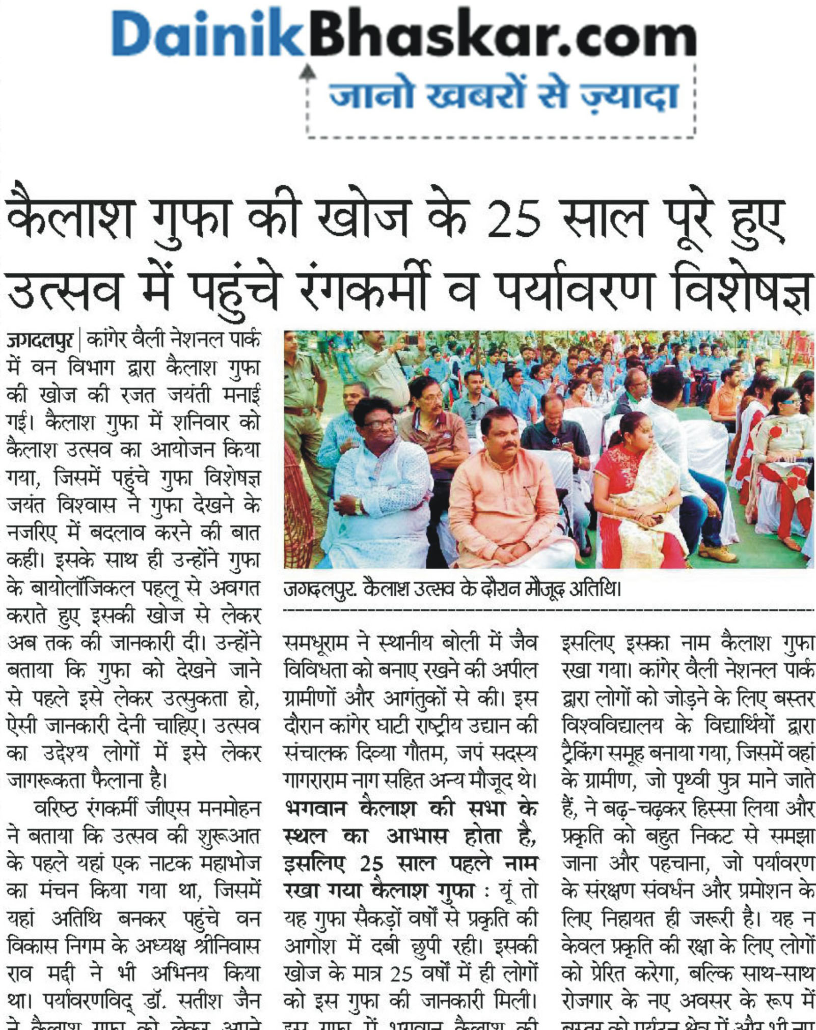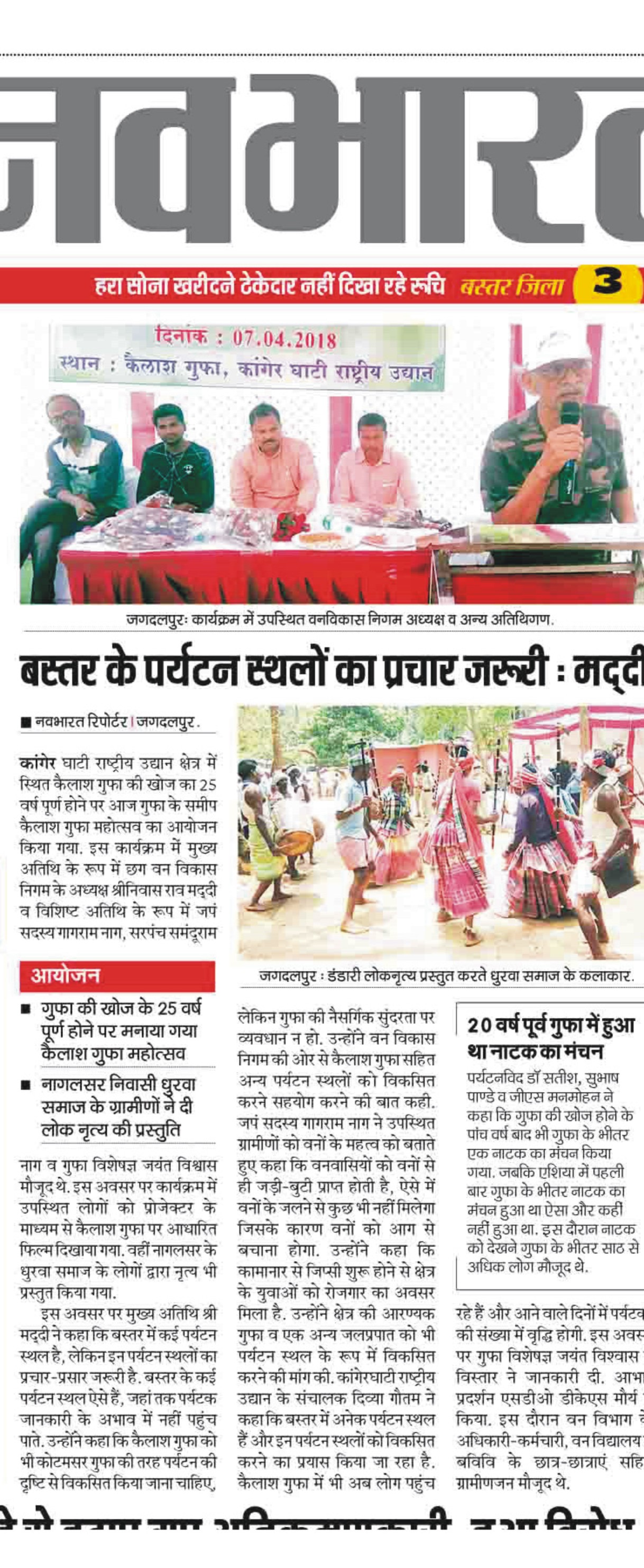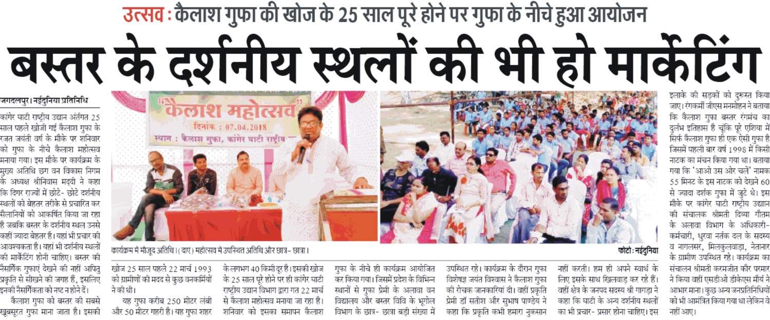 Discovery of Kailash cave of Kanger Valley National Park by the forest department completed its 25 years. The chief guest was Mr. Sriniwas Rao Maddi, President of Chhattisgarh Van Vikas Nigam and presided by the convener Mrs. Divya Gautam (IFS). It was attended by cave scientist Dr. Jayant Biswas who emphasizes the changes in the viewpoint of conservation of caves. He elaborated on the biological aspects and said that people should be made aware of it so that they become curious before entering the cave. Few senior stage artists from Bastar who played a drama inside the Kailash Cave 25 years ago were also invited to grace the ceremony. Environmentalist Dr. Satish Jain in local dialect appealed to preserve biodiversity. During this event Janpad member Mr. Gangaram Nag was also present.