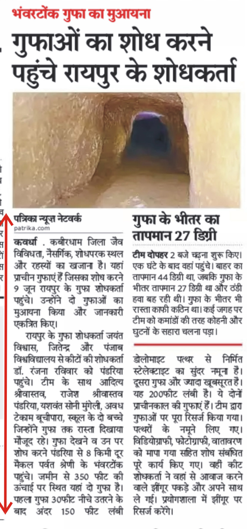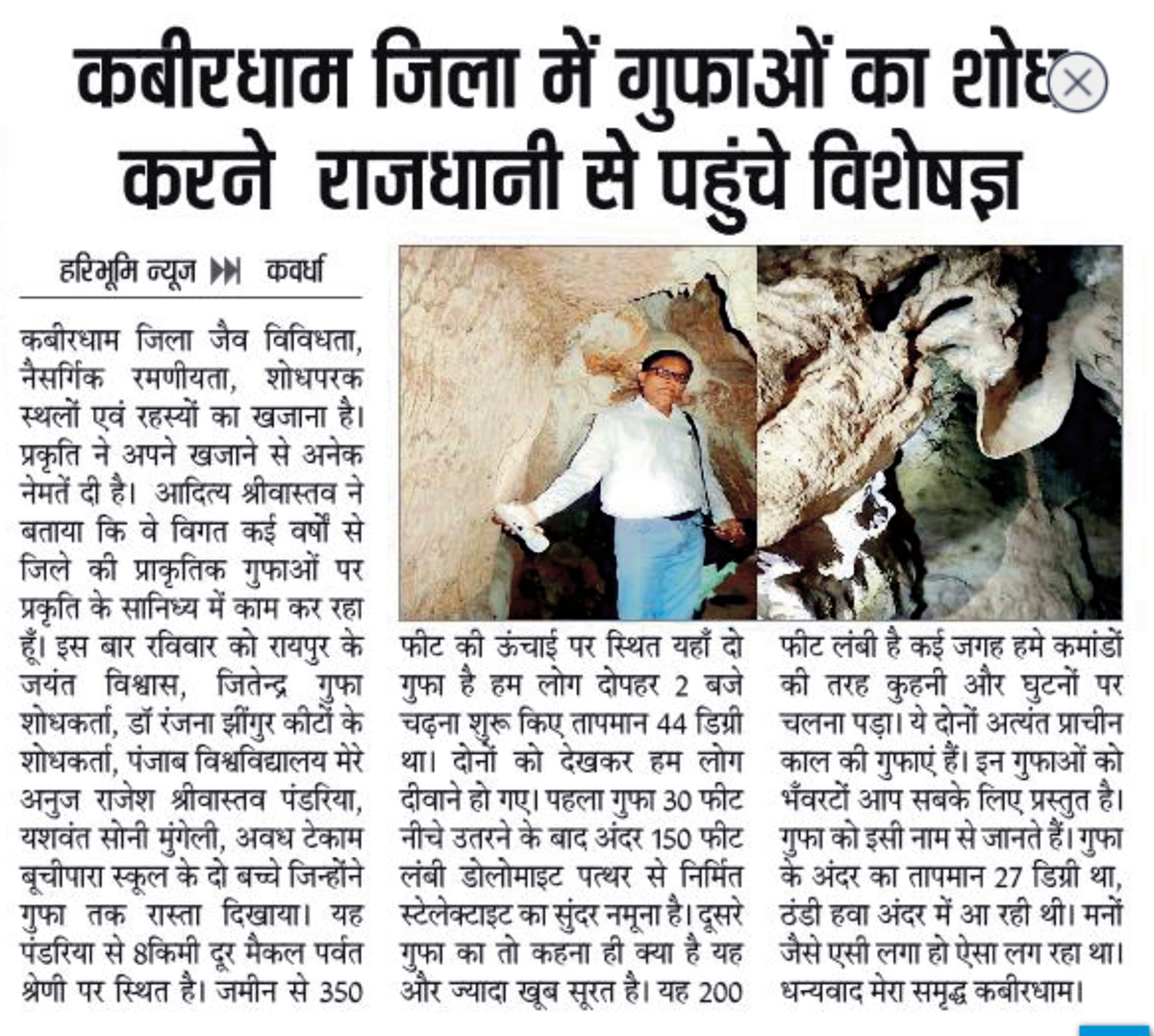 NATIONAL Cave Research and Protection Organisation team surveyed the Valley regions of Kabirdham district. During this survey period they visited, Bhanwartap cave exists in Maikal valley, near Pandariya. In this tour along with Dr. Jayant Biswas and Mr. Jitendra Nakka of National Cave Research and Protection Organization, India, Dr. Ranjana Jaiswara from Punjab University was associated. This survey was escorted by Mr. Aditya Shrivastava of Kabirdham, Mr. Rajesh Shivastava of Pandaria, Mr. Yashwant Soni of Mungeli and Awadh Tekam from Buchipara (local person).