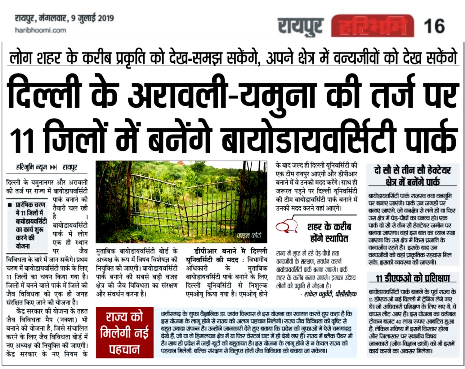 Following the concept of Arawali-Yamuna biodiversity park has been proposed in 11 districts of Chhattisgarh. Biodiversity board will form it where a separate director would be deputed. Presently it is under incharge of PCCF Mr. Rakesh Chaturvedi.