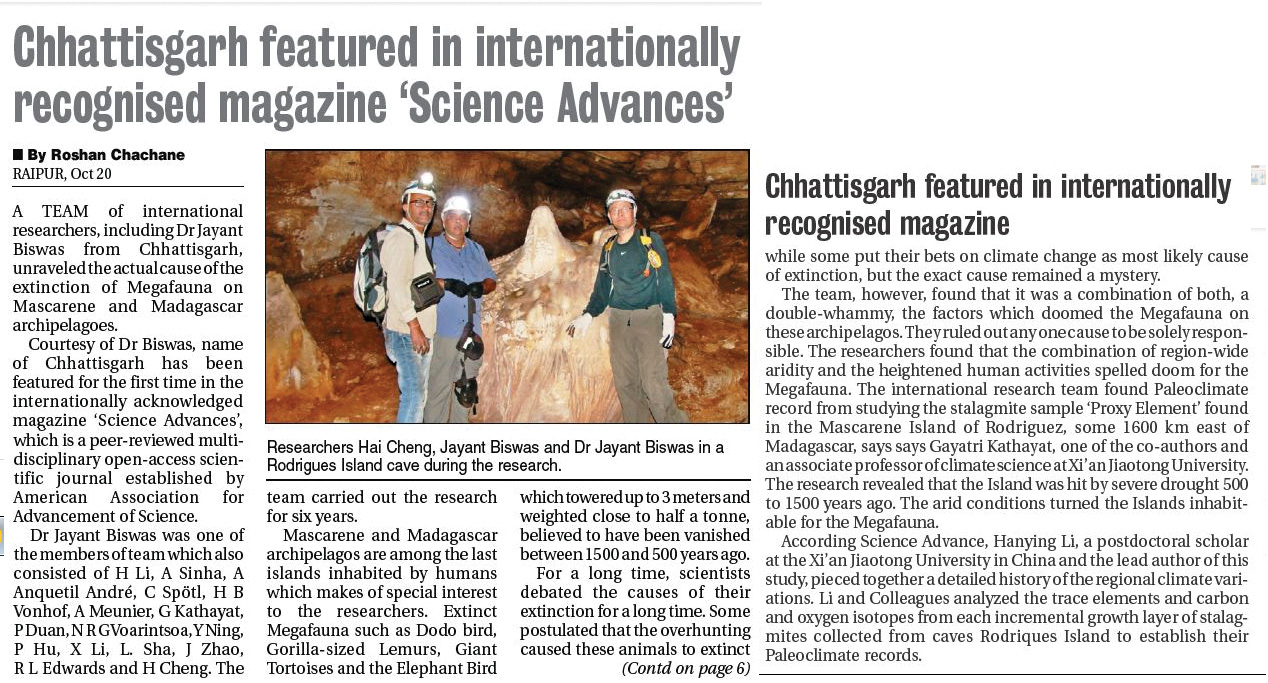 A TEAM of international researchers, including Dr Jayant Biswas from Chhattisgarh, unraveled the actual cause of the extinction of Megafauna on Mascarene and Madagascar archipelagoes. Courtesy of Dr Biswas, name of Chhattisgarh has been featured for the first time in the internationally acknowledged magazine ‘Science Advances’, which is a peer-reviewed multidisciplinary open-access scientific journal established by American Association for Advancement of Science.