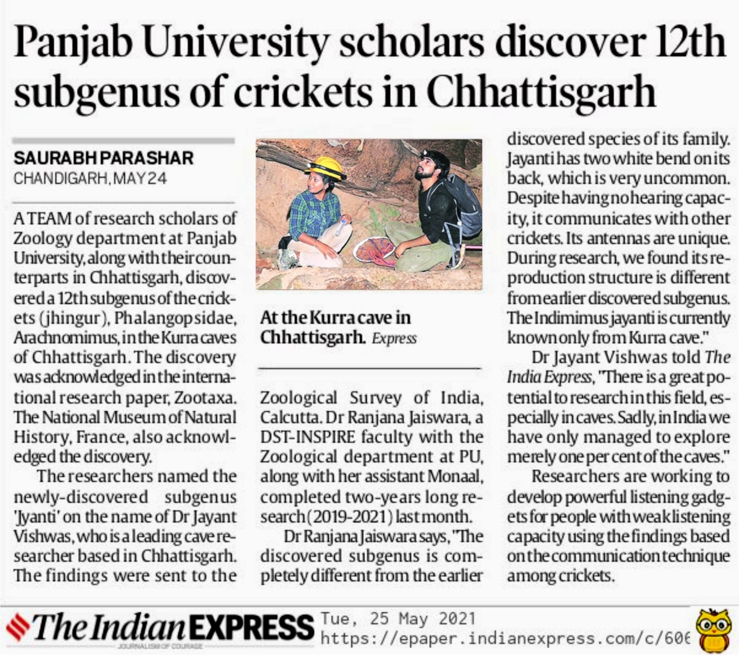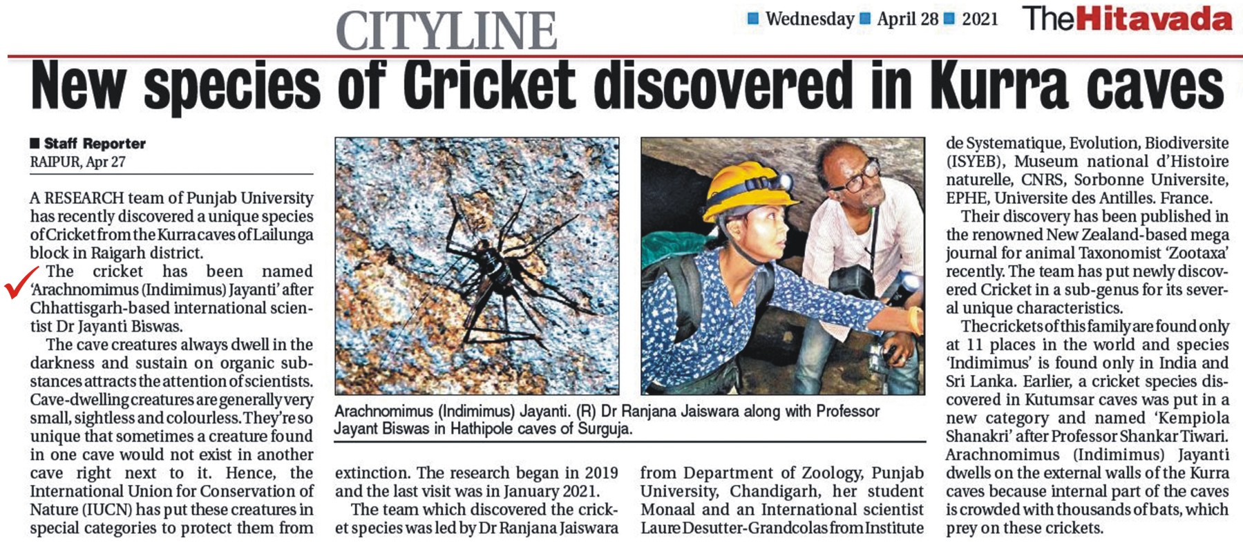 A new species of cricket from a cave of Chhattisgarh "Kurra Cave" has been discovered and given new status by cricket specialist of India Dr. Ranjana Jaiswara of Punjab University in association with Prof. Laure Desutter-Grandcolas of France. The species name is Archnomimum (indimimus) jayanti . The paper published in Zootaxa in the month of April, 2021.