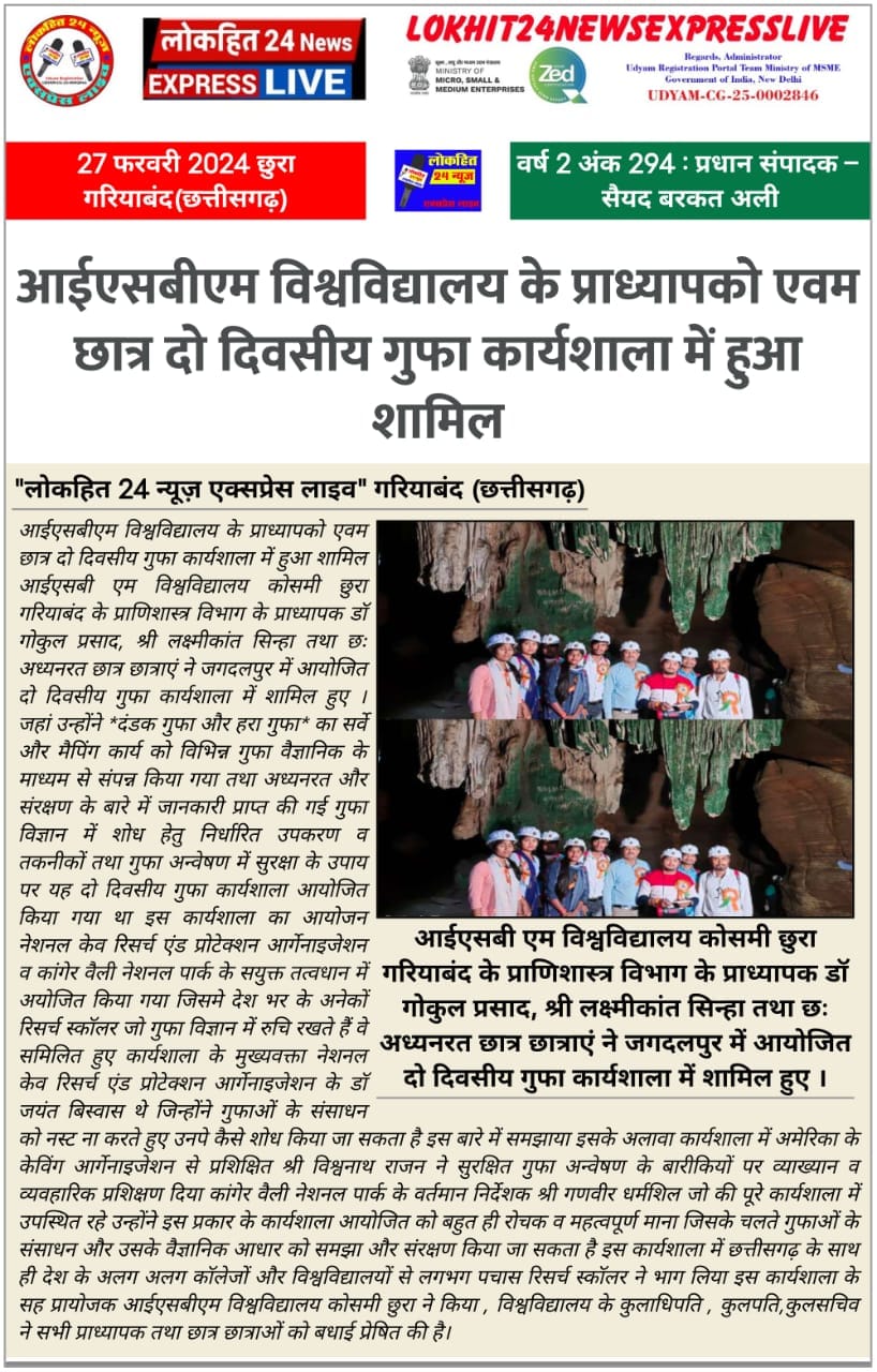 A Workshop entitled "2-day National Workshop on Tools and Techniques Needed for Safe Caving and Studies of Cave Science" was organized by the National Cave Research and Protection Organization (NCRAPO) in the premises of Kanger Valley National Park (KNVP) with the joint execution of the Directorate KNVP, Bastar, Chhattisgarh. More than 70 participants attended it from all over the country. Dr Jayant Biswas (Director) NCRAPO, India, Shri Ganveer Dhammsil (Director) KNVP and Shi Vishwathan Rajan a Scuba Diving instructor, India were the main speakers in it. It was the first workshop in itself from India where all the safety issues of caving and cave mapping were practically explained. In this workshop, all the branches of science which could be approached for higher studies have been elaborately explained. The workshop was highly successful.